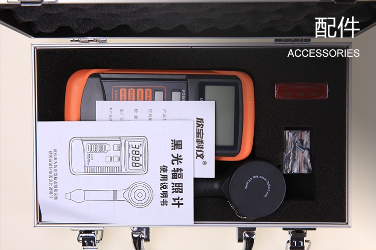 专业精良的黑光辐照计,探测器的光谱:360nm到460nm(峰值405nm,50%以上透过率波段382nm到428nm)。