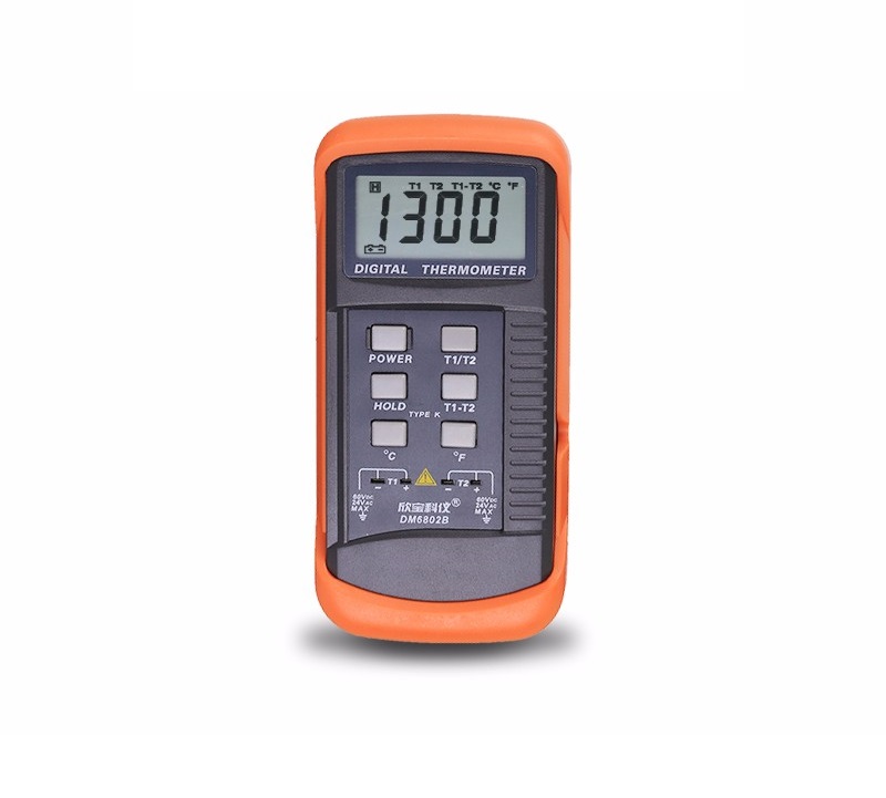 显示: 3 1/2 位LCD显示,字高15mm测量范围: -50℃~1300℃ -58℉~1999℉数据保持功能,华氏/摄氏度转换可分别测量T1通道、T2通道的温度值和T1-T2的温差值