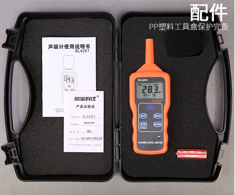 频率范围: 31.5Hz ~ 8KHz 测量范围: (28)30dB ~130dB 频率计权特性: A/C 麦克风: 1/2英寸极化电容式麦克风 显示: 4位数LCD 分辨率: 0.1dB 显示更新率: 每秒2次 时间计权特性: 快速(FAST): 125毫秒 慢速(SLOW): 1秒 测量范围: 范围1: (28)30dB ~70 dB 范围2: 60 dB~100dB 范围3: 90 dB~130 dB 准确度: ±1.5dB(参考音压94dB@1kHz) 动态范围: 40dB 过载指示: 超量程会出现“OVER”提示符,大于量程上限5dB显示“OL”, 最大值锁定: “MAX” 电源: 一节9伏电池 电池寿命: 约110小时 操作环境: 0~40℃(32~104℉)10 %~75% RH 存储环境: -10~50℃(14~122℉)10%~90% RH 外形尺寸:185(长)*65(宽)*35(高)mm 重量: 约156克(包含电池) 附件:电池、说明书 |